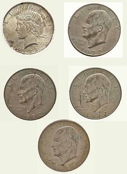 Five silver dollars, including a fairly rare 1923 Peace dollar (Philadelphia mint) plus silver dollars from 1972 (3), and 1977. The Peace dollar, alone, has an intrinsic melt value based on its 90% silver content, which is currently about $36. All coins can be silver polished to shine. $35. Conroe (FM1488 & Old Conroe Rd) Text