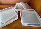 Three Tupperware plastic storage containers. One shows wear but all have great seals and can store anything i.e. craft supplies, beads/buttons, nuts/bolts, coins etc…$7 firm