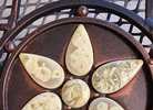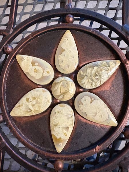 Beautiful metal crucifix with an inlaid center with ornamental stones in bronze finish. A beautiful fleur-de-Lize is displayed at the top. The overall finish is Baroque. The dimensions are: Height 35" Width 28". It is in magnificent, like-new condition.