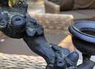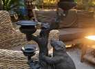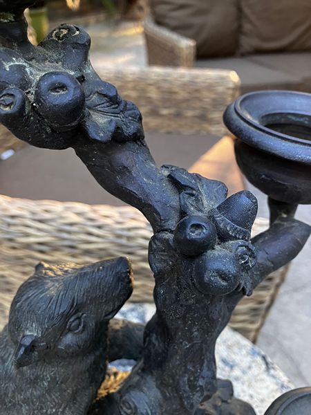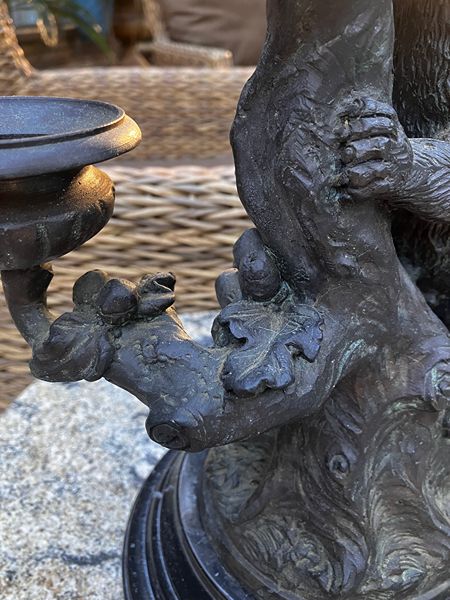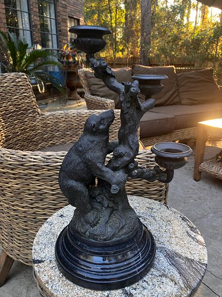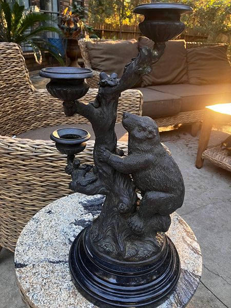 Candle holder with a bear climbing a tree that is adorned with leaves and acorns. I believe it to be spelter with a bronze finish. Base is marble 18" T and 9"W at the base. I believe this to be Maitland Smith but not for sure.