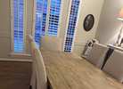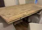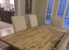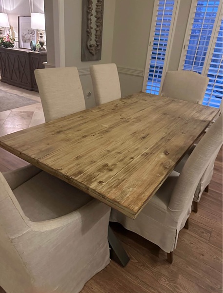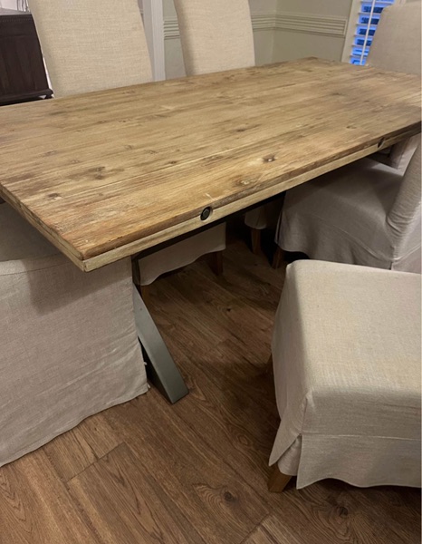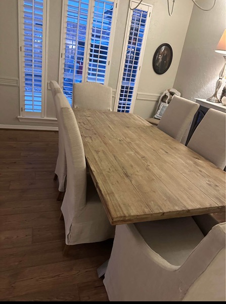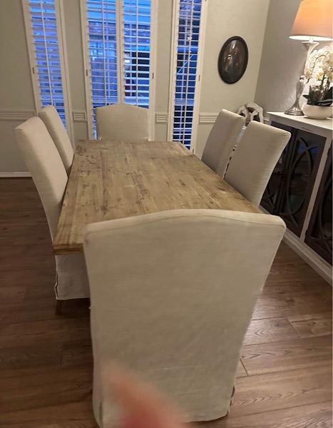 4 side chairs and 2 arm chairs, slip covered from non-smoking home. They have some spots and need to be cleaned and one has some damage from the cat scratching it. Chairs themselves are solid and in great shape. Chairs ONLY. NO TABLE.
