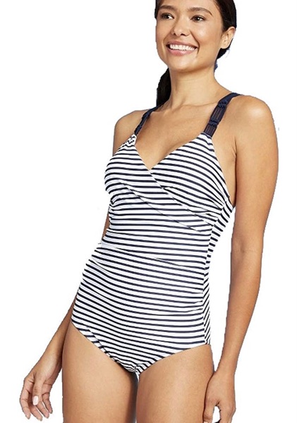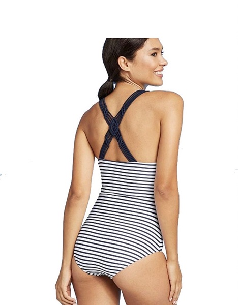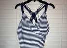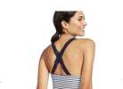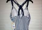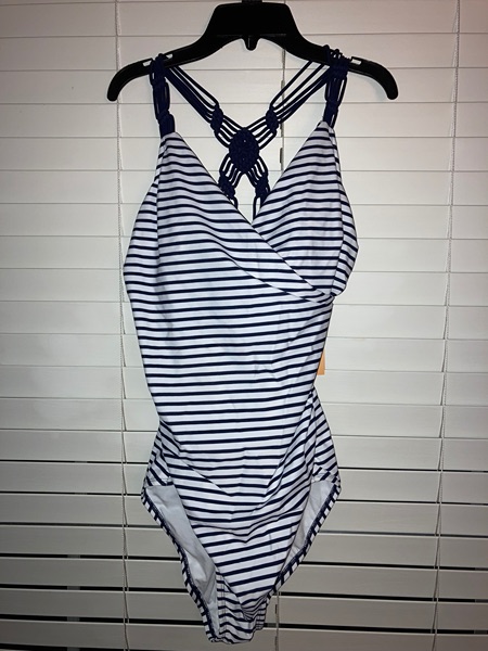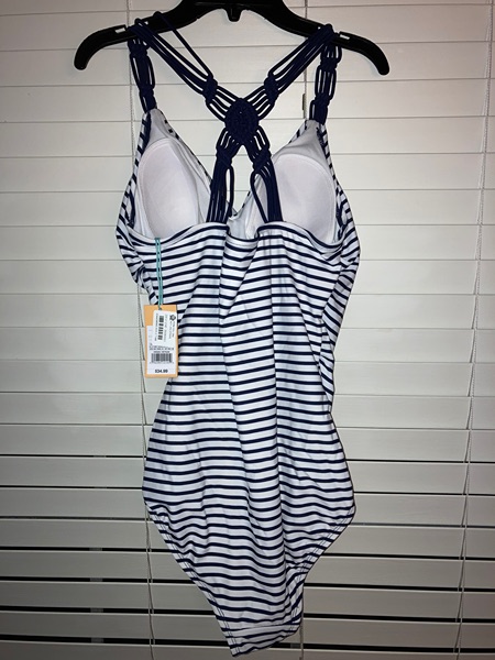 Kona Sol Macrame Strap One Piece Swimsuit - Navy/White Stripe Size Small. Sewn-in cups, V-neck, shirred front, crisscross back, high coverage. New with tags from smoke free home. $10