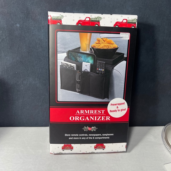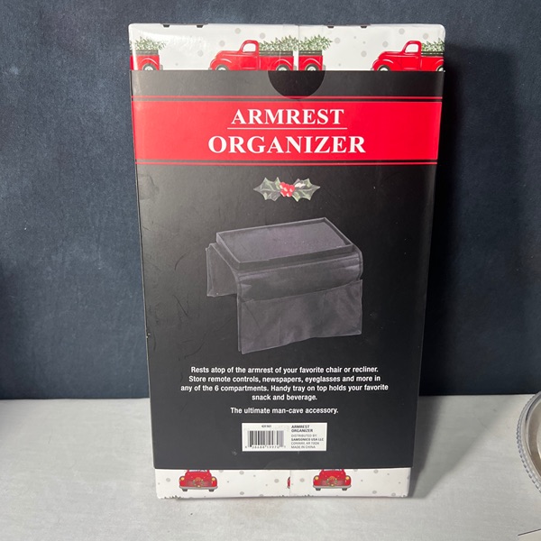 Samsonico 6 Pocket Armrest Organizer Pre-wrapped For Christmas!Man made materials. 11” l x 6”w x 9.5” h. Adjustable wired body.