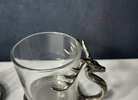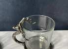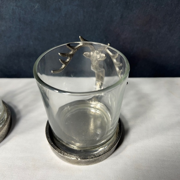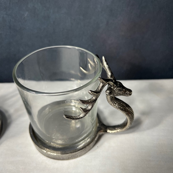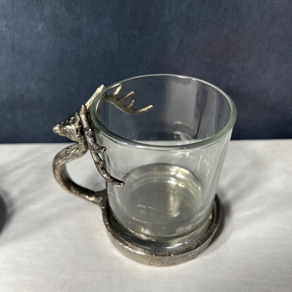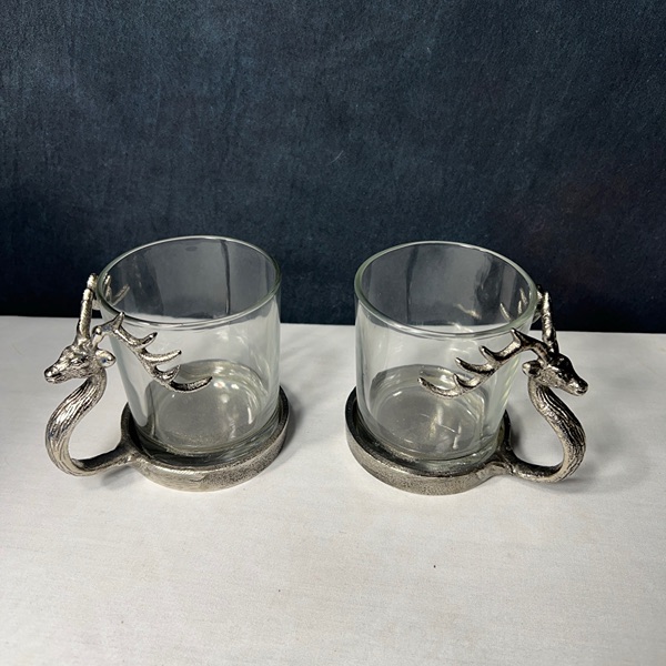 Majestic Deer, Stag, Buck, Reindeer Pewter Handled 8 Oz. Glass Pair. Glass is attached to pewter piece so would be hand wash. No makers mark. Very nice. 4 3/4” wide, 3.5” deep.