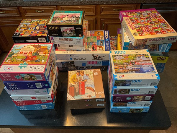 Thirty puzzles. Most all are 1000 piece. Almost all bought new and some not opened.