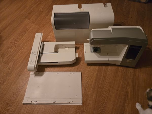 I have absolutely loved thia machine. Comes with the embroidery extension and hard cover shown.