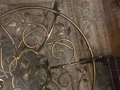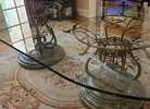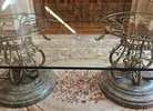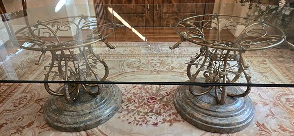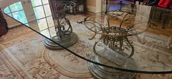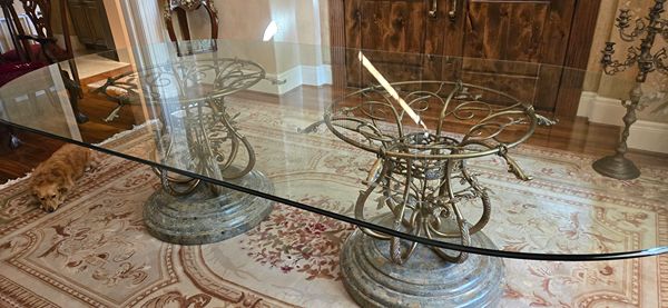 Grand 10 x 5 ft. Beveled Oval Glass Top Dining Table with 2 Pedestals!  Pedestals have heavy bases and metal floral leaf design.  Very beautiful!