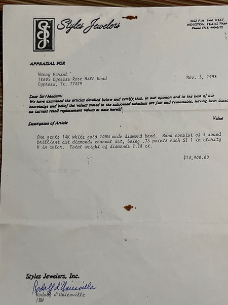 Beautiful men's 14 karat white gold diamond ring. The band consists of three round brilliant cut diamonds channel set being .76 points each S 1 1 in clarity H in color. Total the weight of the diamonds is 2.28 carrots was purchased in 1998 for $10,000. It appraised in 1998 for 14,900 it assured to have appreciated since then.