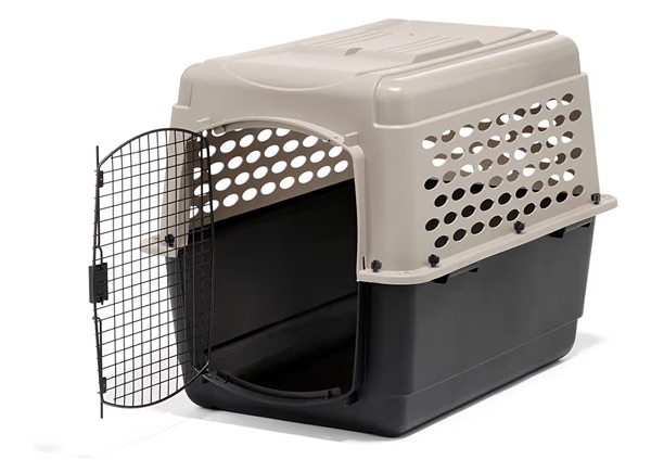 Durable plastic dog carrier / kennel with metal door. We have two available- one for a 65lb dog (L) and one for a 90 lb dog (XL).
