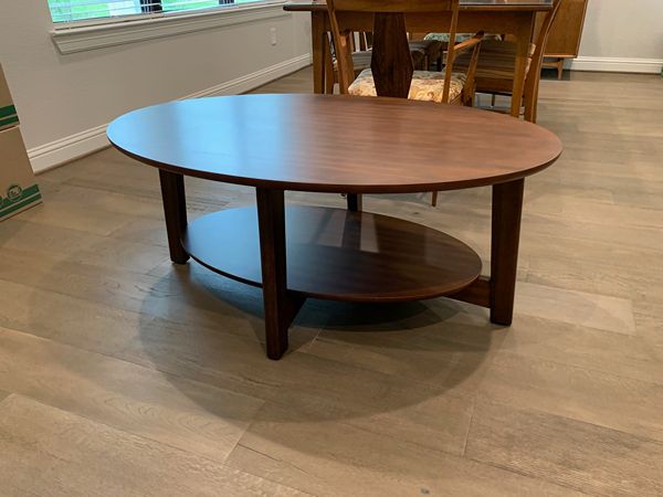 Oval coffee table, new, has small blemish on lower shelf edge (see pic). Wood, with laminate top and shelf. 48L x 32W x 20H. $50 call or text 7138050382