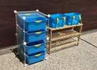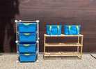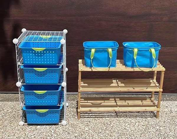 Includes a metal rack with blue baskets and a wooden shelf with blue bags…$50 firm