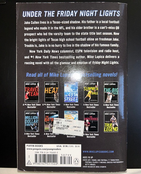Football novel for ages 10+. Light wear around the cover edges but pages are in tact with no writing, highlights, or dog ears. Smoke free home. $3