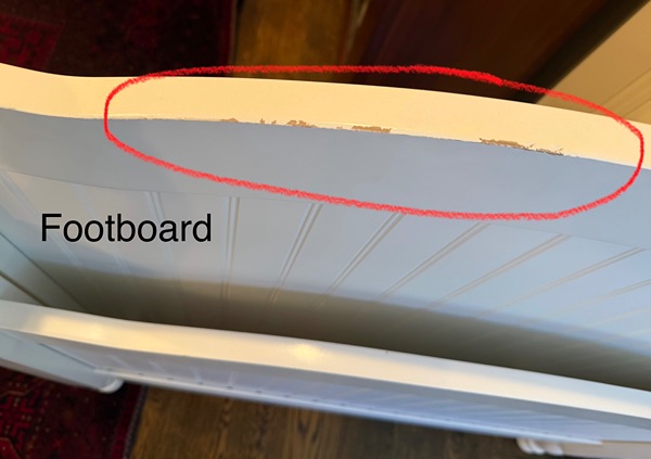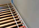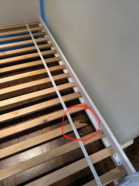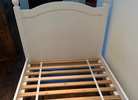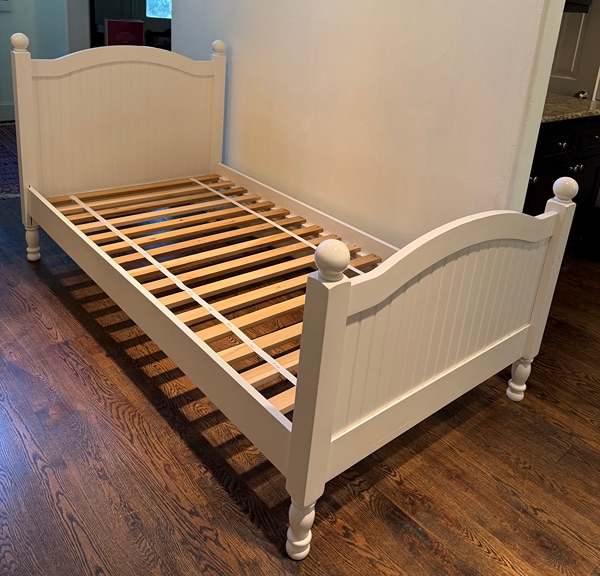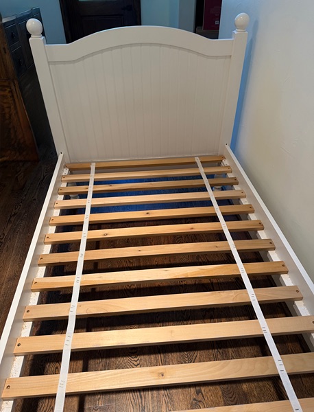 Twin bed includes frame with slat roll foundation, headboard, and footboard. Excellent structural condition except 1 slat is damaged and there are some surface marks due to normal wear. *see photos.
