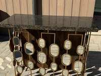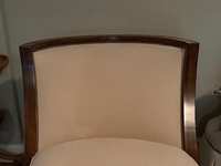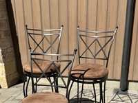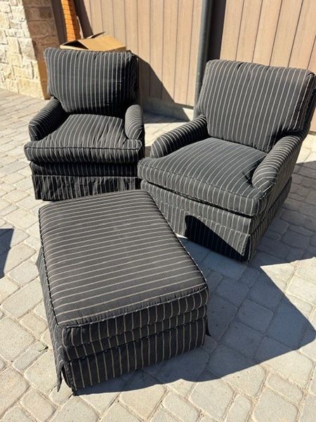 Comfortable striped armchairs with matching ottoman. Ottoman is missing one roller leg. All are swivel.