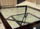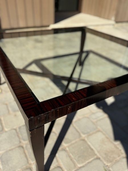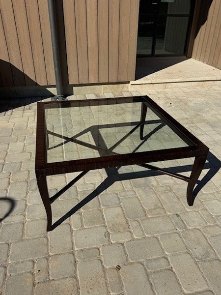 Square glass top coffee table with dark wood frame. Some wear and tear. 42x42x20