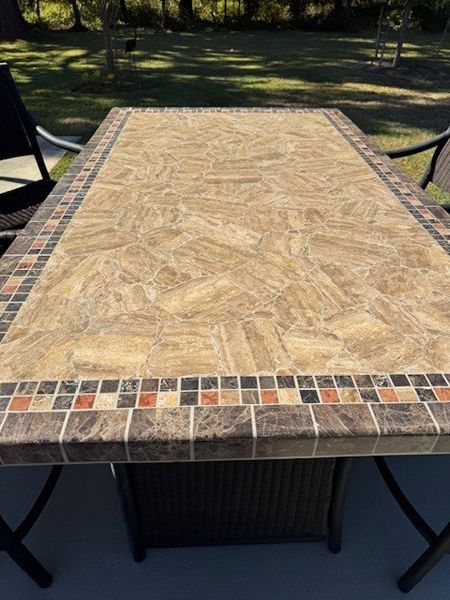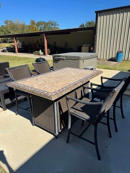 Frontgate brand patio furniture, heavy duty. Good condition. Table and 4 barstools. Table: 42" x 72" x 38 high. Barstools: 23.5 w x 26.5 d x 44 h.