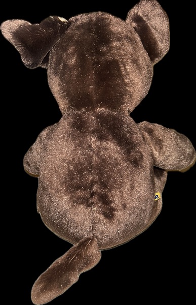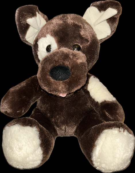 Fudge Pup is a brown and white stuffed dog with a spot over one eye. Originally from 2011, he is now retired. He's about 10.5 inches tall from the crown of his head to his bum. He's in very good condition, as he was mostly on display. No holes or tears, smoke free home. $10
