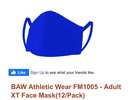 BAW Athletic Wear adult face masks, one size, style FM 1005. These are 2 layers with adjustable nosepiece, and they can be used in sublimation. These come 12/pack and are currently selling for $40/pack online. They are new and only removed from package long enough to get a picture. Smoke free home. $5