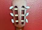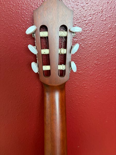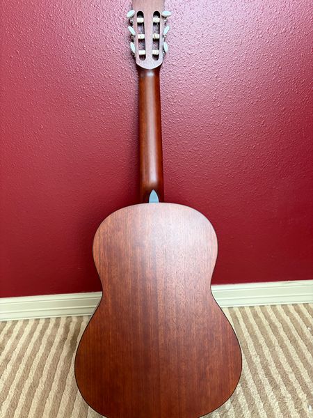 Cedar top with rosewood fingerboard and bridges. The nut width is 2.05" and the string length is 25.6". It has 19 frets and is a matte finish. The nylon strings are very loose, as my daughter has not played this guitar in some time. It is in excellent condition, barely used, as she chose to play her acoustic guitar instead.