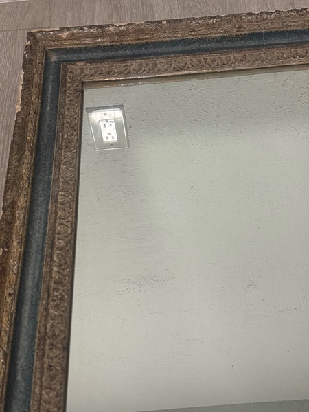 The mirror glass itself appears original or period-appropriate, with a slight speckled haze (foxing) visible in spots, which is common in antiques over 100 years old and adds to its authenticity. The backing is a simple fiberboard panel (likely Masonite or similar pressed wood) secured with metal corner brackets and wire hangers, typical for mid-20th-century mounting of older frames.