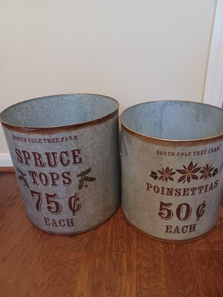 Two metal Christmas containers for plants/bath towels or logs