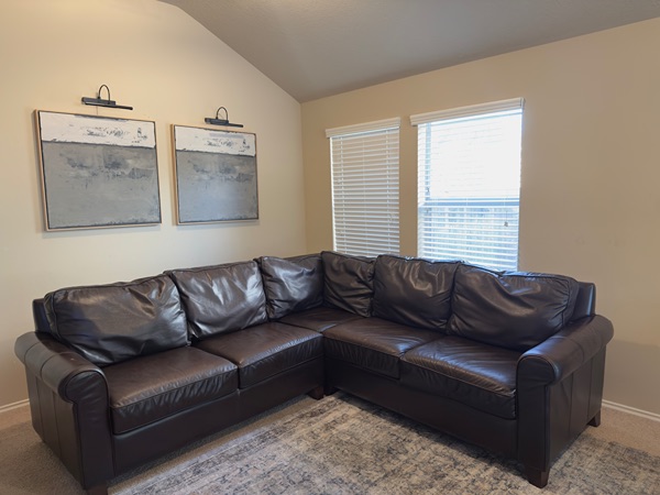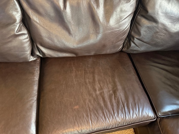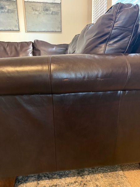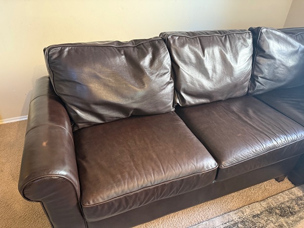 Gorgeous 3 piece Sectional from Pottery Barn. It’s in great condition. We just cleaned and conditioned it. No rips, normal wear. This couch is super comfortable (still firm), genuine leather that will last you. Theres a few scruffs on the armrest & minor scratches (top cushions only).