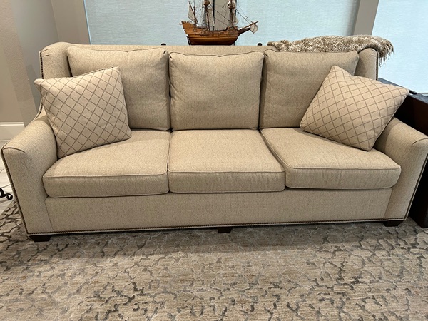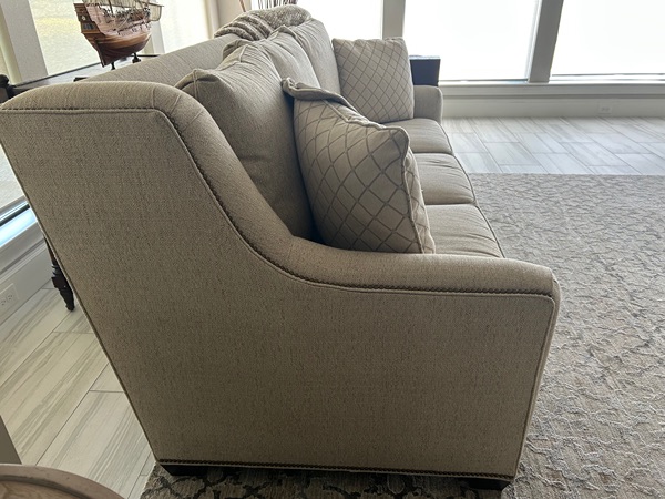 Quality couch purchased from Batholet for over $2500. Redecorating....my loss is your gain! Neutral color "oatmeal". L: 88", D : 36", overall H :37". Comes with 4 throw pillows (2 without inserts) . Excellent condition from son-smoking, no pet home.
