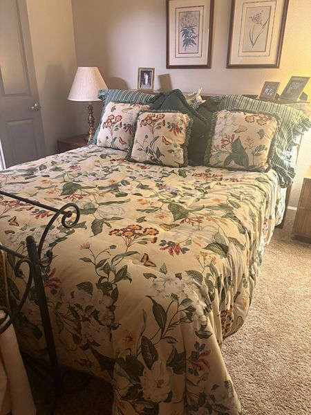 For sale is a complete set of king-size Williamsburg comforter, bed skirt, one curtain, two pillowshams, eight pillows, all in excellent condition.