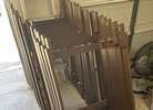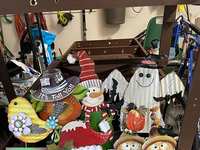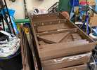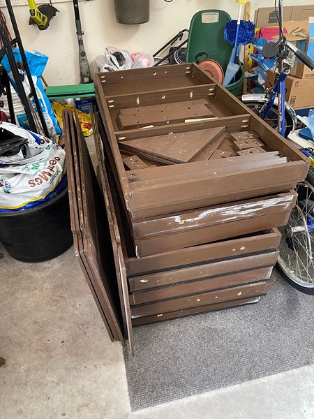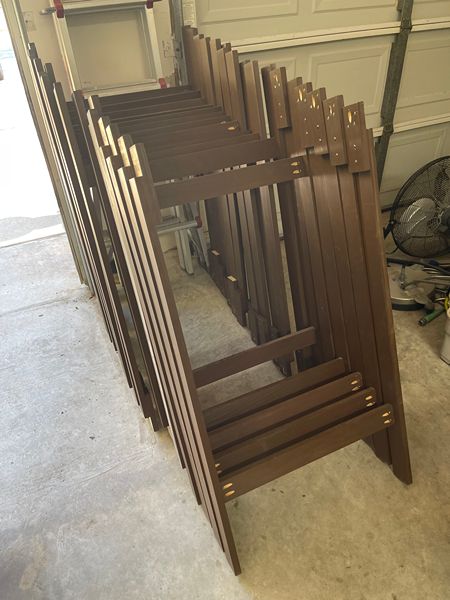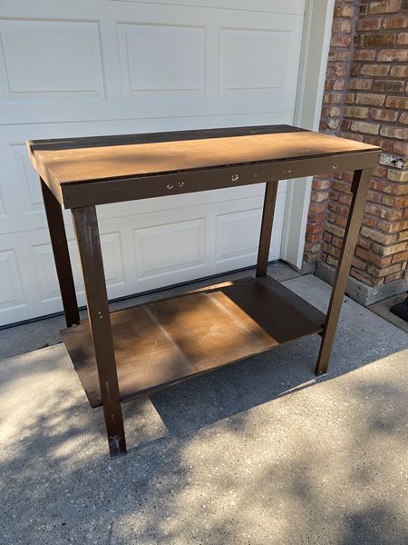 TEN 2' X 4' WOOD TABLES. 44" HIGH. SIX HAVE SHELVES. PREVIOUSLY USED FOR A MODEL TRAIN SETUP.