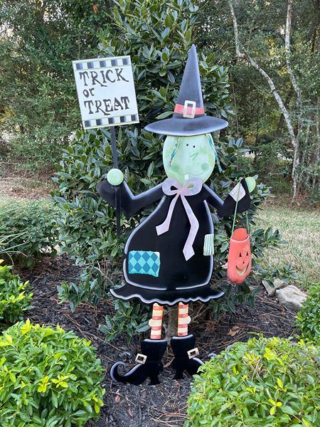 FRIENDLY WITCH IN GOOD CONDITION. TRICK OR TREAT SIGN, PUMPKIN BAG REMOVABLE. POST BELOW HER FOOT STANDS HER IN THE GROUND.