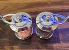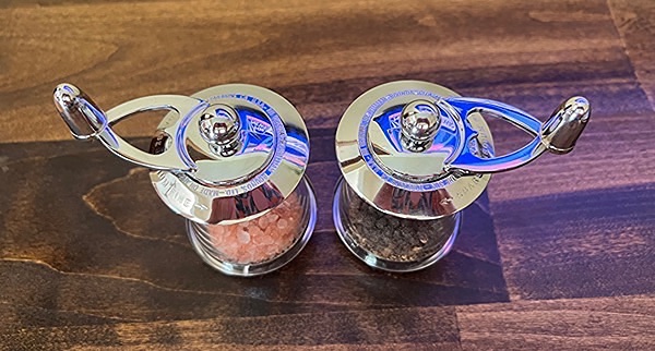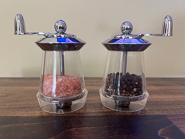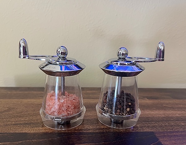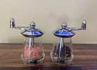 Made in the USA by William Bounds Ltd. Made of Acrylic and chrome, each stand 4” tall and can adjust for coarse, medium and fine grind…$30 total, firm