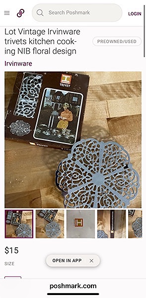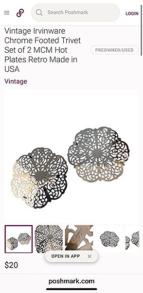 From the 1970s, Made of chrome and gold plated metal, both trivets have a diameter of 4” and each comes with three rubber tipped feet for stability. Produced by the Leonard Silver Company under the Irvinware brand, this original piece exudes the fashion and elegance of the 1970s era. Perfect for all occasions, this trivet is a unique collectible item that adds a touch of vintage charm to any kitchen or dining area…$10 total, firm