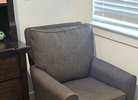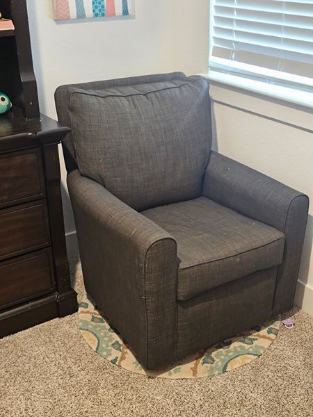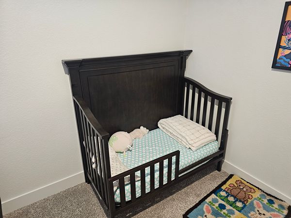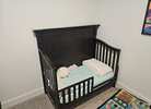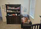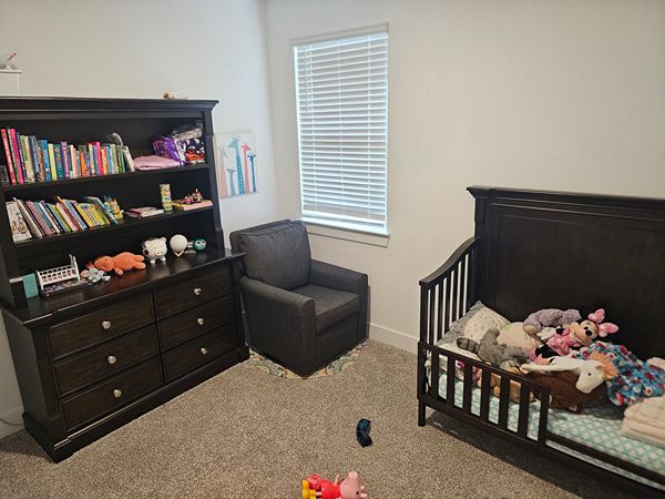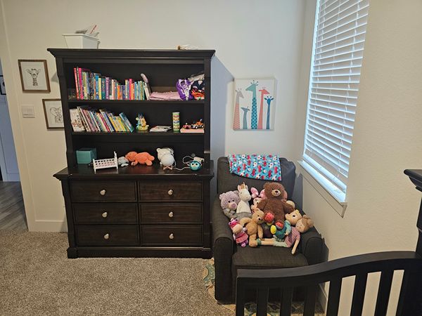 Solid wood convertible crib to full size, dresser with shelves and a rocker.