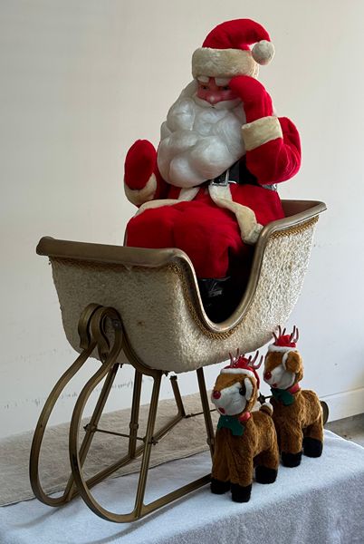 Vintage Harold Gale Santa in Sleigh with two Rudolph Reindeers. 44-inches tall. Santa is in good condition, white trim on suit is discolored, sleigh has one broken runner. Harold Gale Displays began in 1946. This Santa and sleigh were used for a Coca-Cola display in the 1960s/1970s. The musical reindeers are from the 1980's but do not work. $40