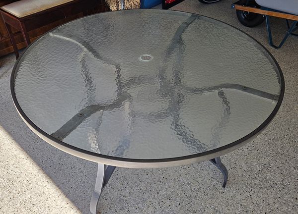 48' x 28' H round glass topped table. From Chair King. Buyer collets