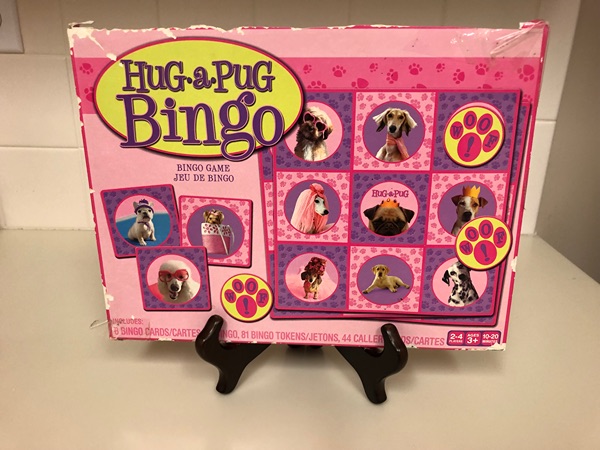 Bingo game for kids using pictures so even the younger ones that don't know numbers yet, or how to read can enjoy this game. Played just like regular Bingo, but dogs faces are the things you cover. Box is a little beat up from general wear and tear. Free