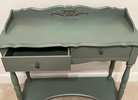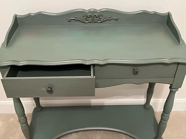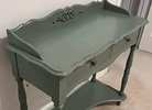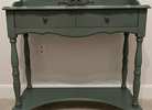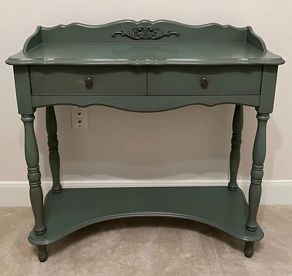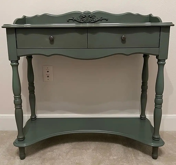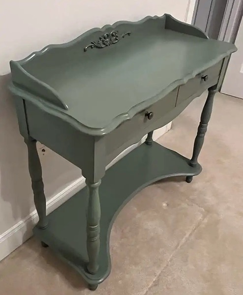 Elegant sage green wooden console entry table with two drawers and decorative details. Was in a spare room and never used…$100 firm