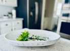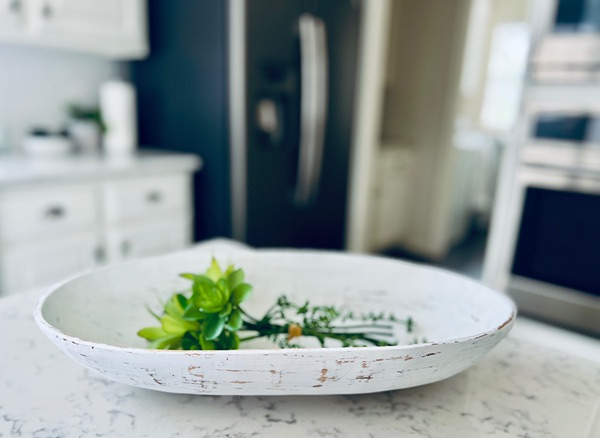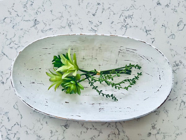 Large rustic bowl/tray featuring a distressed white finish. Succulent stems included. $15, porch pickup in The Woodlands.
