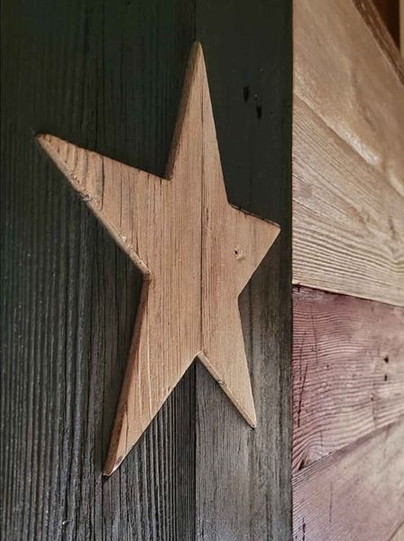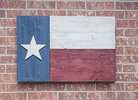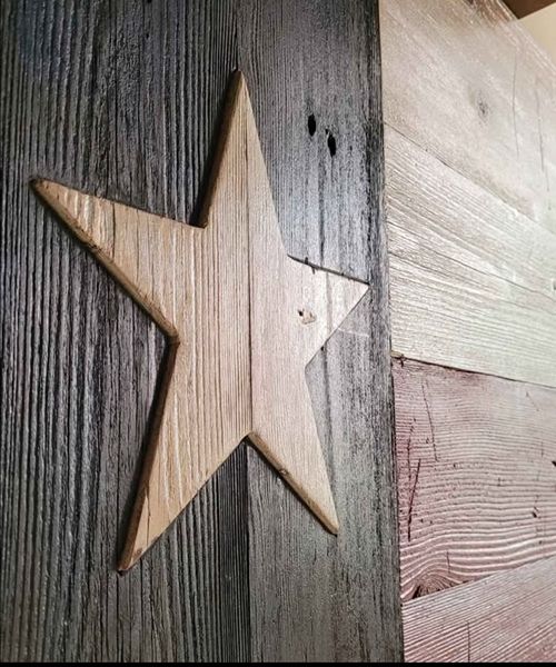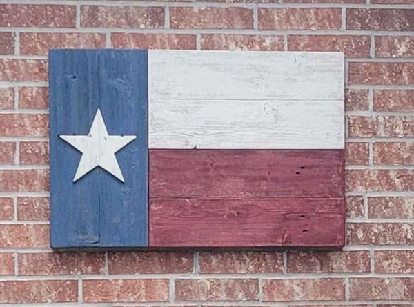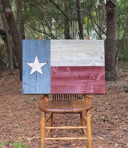 Wood Texas flag made with reclaimed cedar. 21' × 31' × 2' (dimensions are approximate). Sealed with exterior polyurethane. Every flag is unique. Color tones and wood textures will vary slightly from flag to flag. Custom sizes available. 3R Woodcrafts 832-746-l8O6 Text only please