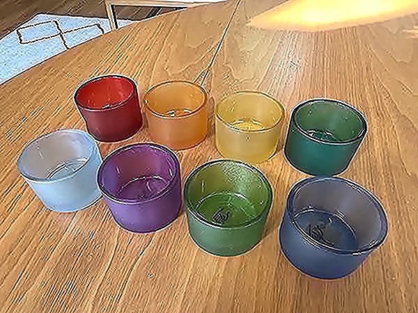 Set of 8 colorful glass candle holders in rainbow colors. New! Each 1 1/2” x 2”…$15 firm