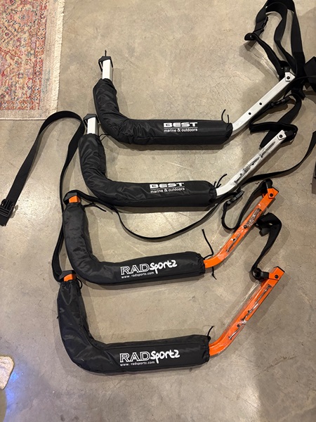 Brands are BEST Marine & Outdoors and RADSportz. Both are sturdy, padded, and work great for kayaks, SUPs, canoes, or general garage storage.