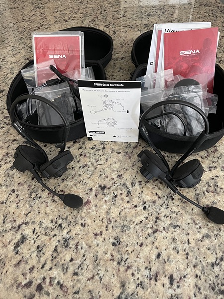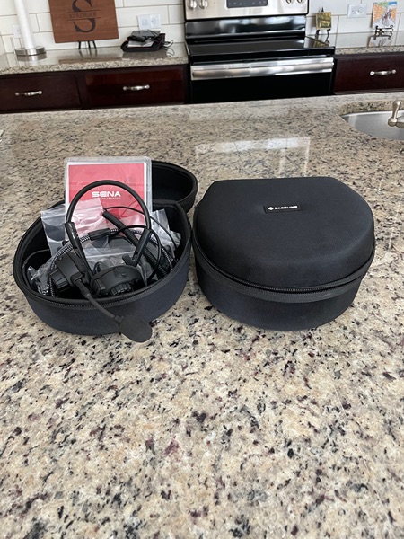 2 -Sena Bluetooth headsets. Includes storage case and extra ear pads.