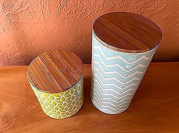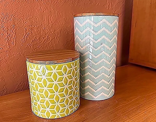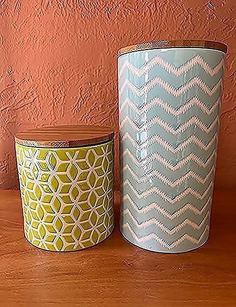 Green and blue geometric patterned ceramic canisters with bamboo lids