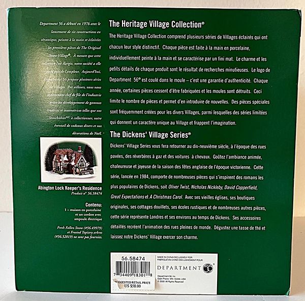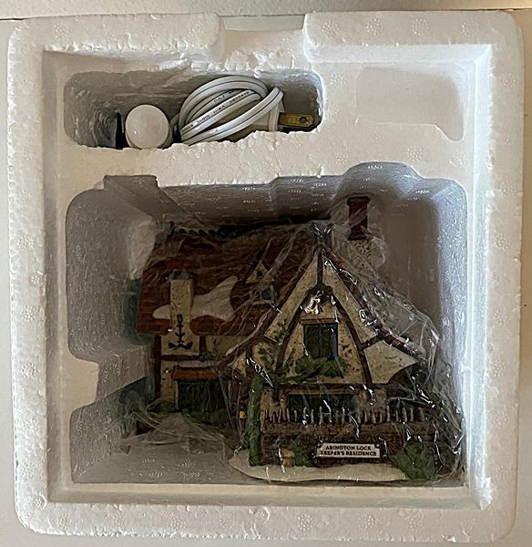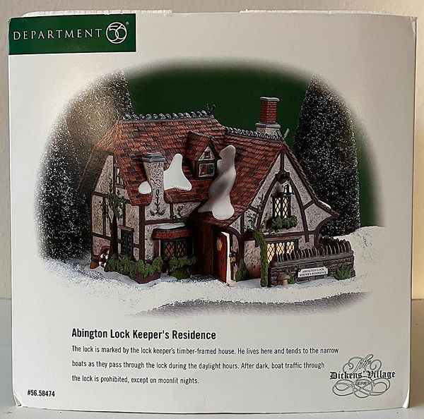 Department 56 Dickens' Village Abington Lock Keeper's Residence item 56.58474. This was only in production 2000-2002. It has intricate detailing including the tile roof, ivy, and winter snow accents in a matte porcelain finish. It has never been removed from its box. The photo of the building itself is a stock photo, but the other photos show how it is packed and the outer box and packaging is the exact item you will receive. It is in the original box, outer sleeve and inner Styrofoam with all accessories it came with. From a smoke-free home. Pick up in Alden Bridge, The Woodlands. Contact me through this site or text me if interested or have questions.
