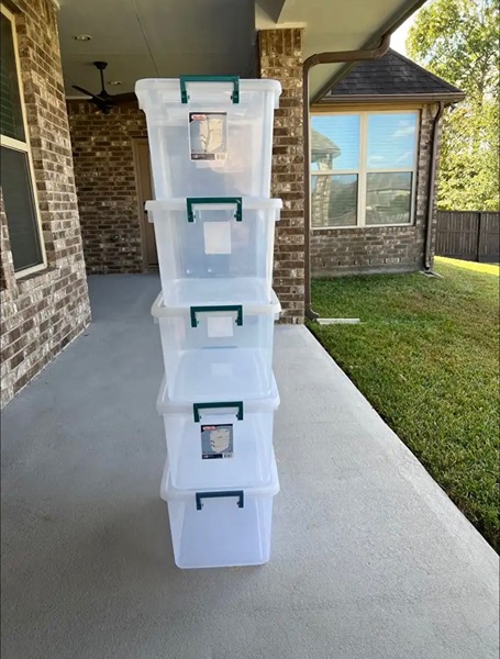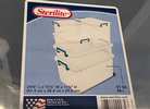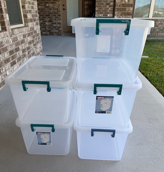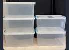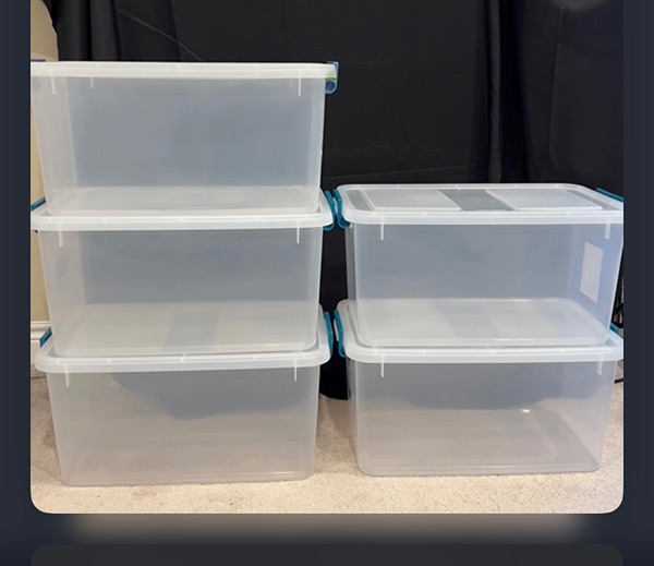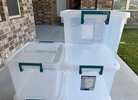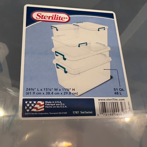5-51 qt, 24 3/8" L X 15 1/8" W x 11 3/4" H. Durable plastic bins by Sterlite with turq. Snap on handles. Very good condition.