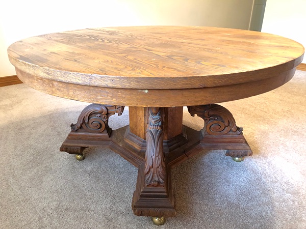 Came from England. Purchased in 1975 in Leavenworth, Kansas at an antique auction. Base has 4 carved rams heads. Table is 40 inches tall and 54 inches in diameter. Wood is oak. Asking $300.00.