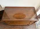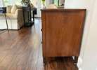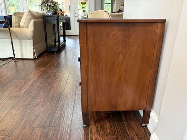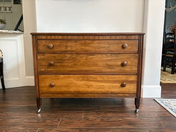 Three drawer chest measures 43” wide X 21” deep X 32” high with glass insert on top on rollers.