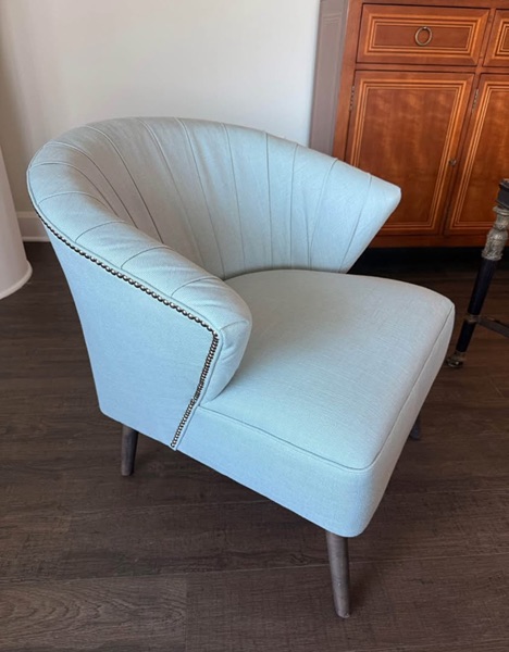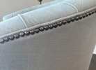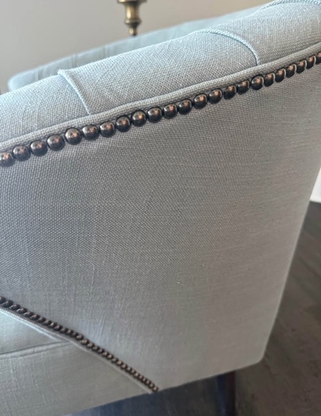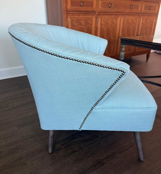custom lee industries upholstered chair...pale blue linen with nickel nailhead trim...perfectly new condition