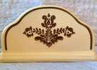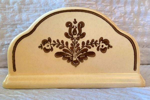 NAPKIN HOLDER: 3½” height & 7” length; the graphic is presented front and back. Impressed Pfaltzgraff family castle logo on underside. Popular replacement site prices at $39.99.