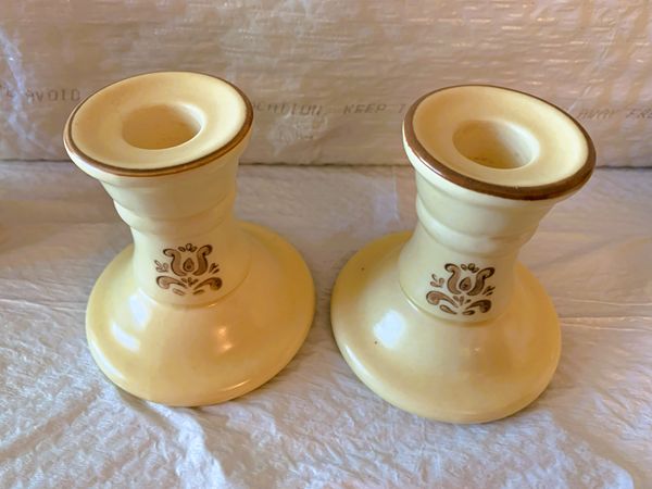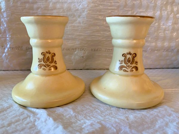 CANDLESTICK HOLDERS: 3 5/8” height, 3½” width; design front & back. These are unbranded; other pieces in the collection show the impressed Pfaltzgraff family castle logo. Popular replacement site prices each piece at $7.99.